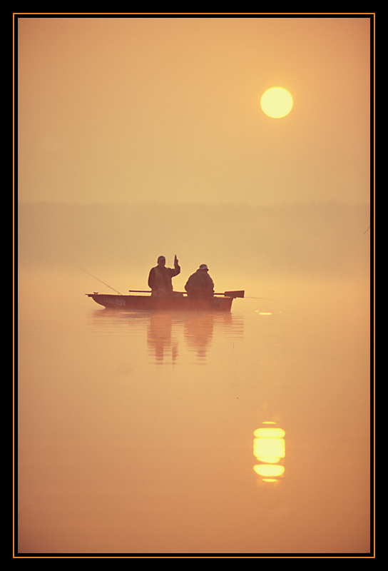 200mm, Velvia 100F, skan... Poleskich poranków ciag dalszy... jeden z panów pokazuje swiezo złowiona rybę, ale bardziej wyglada to na flaszke, z tad tytuł taki, a nie inny...