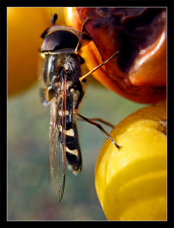 ... raz jeszcze. Tym razem chyba lepiej widać, że to nie osa a zupełnie niegroźna muchówka, tylko tak sprytnie ubarwiona.