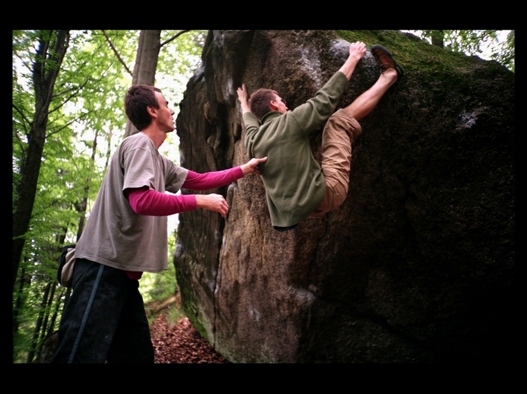 Fajny moment, ale spójrz na to krytycznie. Na pamiatkę dla kolegów jak najbardziej. Jako zdjęcie - słabo. Niebo białe, całość nieostra, ciemna plama głazu po prawej stronie w połączeniu z jasną stroną zdjęcia po lewej jakoś nie gra. A może by zacieśnić kadr, zrobić wspinającemu zdjęcie. Chciałbym zobaczyć jego twarz. Mogłoby być ciekawe. Pozdrawiam