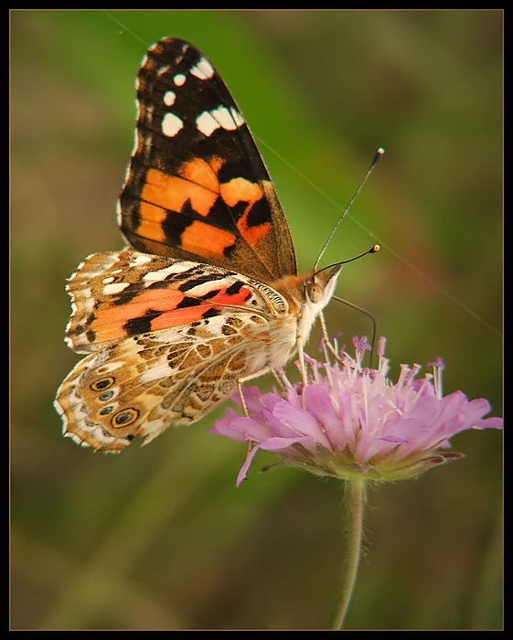 Skrzydła o rozpiętości 55-60 mm, z wierzchu skrzydeł pomarańczowo-różowe z czarnym rysunkiem i białymi plamkami przy wierzchołkach przednich skrzydeł.