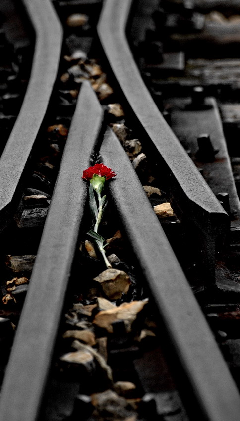 Rozwidlenie torów. Rampa kolejowa w Obozie Zagłady Birkenau. Tutaj kończyła się droga męczrni. Tu zaczynała się nowa- bez huku i nienawiści.. tu przywożono więźniów do budynków zagłady. Odwrócona \\"Victoria\\".. ale to IM kladzie się goździki na tory. Dziwne.. aż słychać stukot żelaznych kół... Birkenau, 8.IX.2007, Nikon D50, Sigma 70-300mm