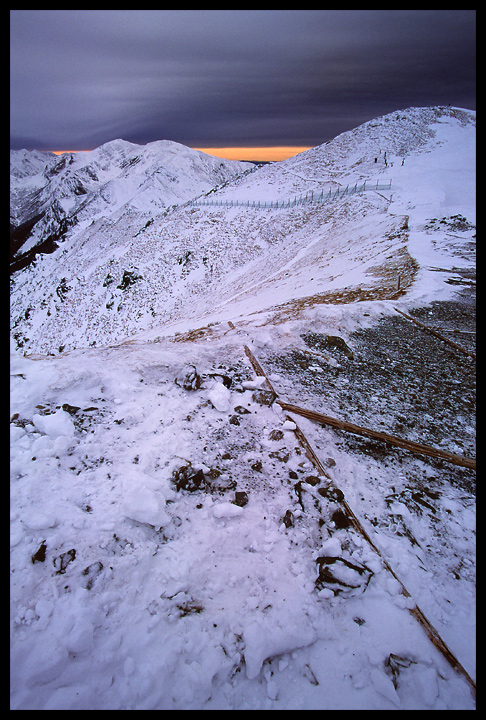 Byłem mocno zaskoczony, że coś wyszło z tego wypadu na Kasprowy. Czasy naświetlania na poziomie 1/10-1/8 s przy ogniskowych 17-24 mm robione z ręki, wiało całkiem mocno i do tego mróz dawał się we znaki, na tyle że ręce mi skostniały i mogłem pomarzyć o operowaniu statywem, dlatego go nie użyłem, bo na plecach był. Nawet nie mogłem wystarczającej korekcji ekspozycji wprowadzić ze względu na punktowy pomiar światła na śniegu, bo czasy stawały się nie do zrobienia z ręki. No ale coś tam ostatecznie mam z tego popołudnia... || Minolta Dynax 7, Sigma 17-35mm f/2.8-4, Velvia 50, skan ze slajdu, na PE chyba lepiej.