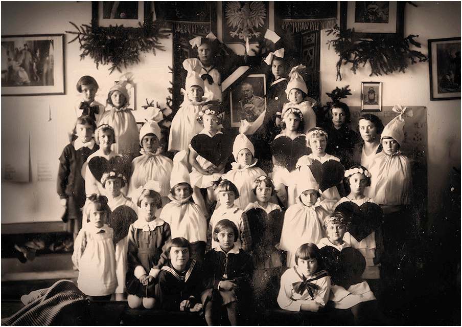 jak w tytule... na odwrocie fotografii - przy pomocy narysowanych cieniutkim piórkiem linijek dedykacja: "Kochanemu Panu Dyrektorowi ofiarują uczennice II giej klasy." Skałat dnia 25 III 1935. R. - wypisana okrągłym, starannym, dziecinnym pismem. Oraz podpisy: Rózia Friedman, Stanisława Semaszczuk, Rena Halpern, Eleonora Kurowska, Felicja Sławatycka, Krystyna Polakówna, Berła Zimer, Lińcia Schapira, Tysnarzewska Janina; ponieważ podpisów jest mniej niż dzieci na fotografii dodam, że wśród uwiecznionych jest również moja Mama :)