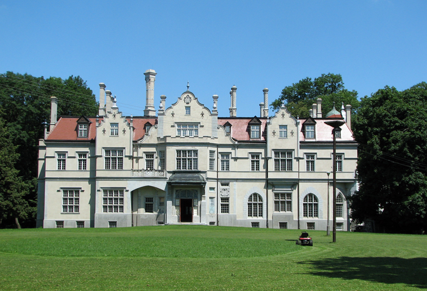 Wybudowany w l. 1904-05 według projektu wiedeńskich architektów Ferdynanda Fellnera i Hermana Hemlera w stylu neogotyku angielskiego. Zaliczany jest do najwybitniejszych realizacji neogotyckich w Polsce. Ostatnim przedwojennym właścicielem był znakomity rzeźbiarz August Zamoyski. Po wojnie mieściła się w nim szkoła rolnicza a od roku 2000 przeszedł w ręce prywatne. Wokół park z wieloma okazami drzew pomnikowych.