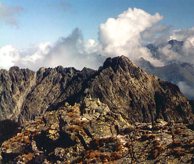 Tatry. Widok ze Świnicy na Kozi Wierch. W dali po prawej wyłania się wierzchołek Lodowego. Wrzesień 2000.