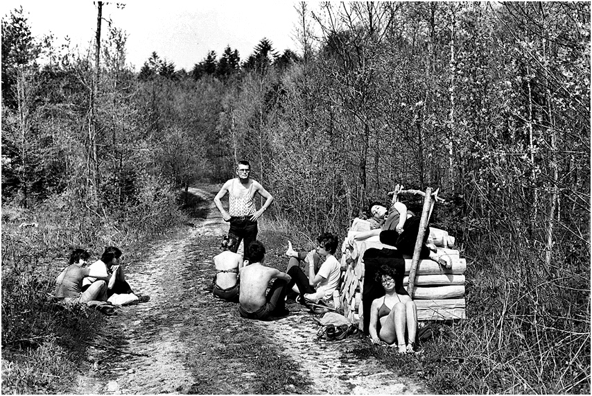 kurs terenowy z geologii historycznej, Góry Świętokrzyskie, zajęcia terenowe studentów Wydziału Geologii UW. Początek lat 80-tych (wiosna 1980?). Aparat Practica LLC, obiektyw standardowy, z ręki.