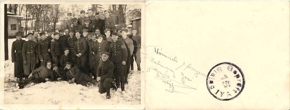 Z szuflady ...nie mojej. Kumpela mojej przyjaciółki dostała w spadku mieszkanie z dobrodziejstwem inwentarza. Zaproszeni na parapetówkę wjechaliśmy na imprezę. Część mieszkania było już jako tako zaopatrzone w ikei reszta czakała na remont. Bar zorganizowano na starym lekko modernistycznym przedwojennym biurku. Żal mi było orzechowego baltu i drzwi ale nie miałem szans bo mebel był już sprzedany komuś...ze znajomych. W chwili gdy pojawiła się główna ekipa gości okazało się , że trzeba przestawić biurko by wstawić butelki do niego. O to już jest coś. Luknę sobie do wnętrza. Biurko jak biurko trochę pinezek, ołówki kopiowe, temperówka żyletkowa, kawałek kwitu z resztką nadruku \\\\"... Kasa bagażowa PKP Stacja Stalinogród...\\\\" i jedna mała fotografia z żołnierzami. Na odwrocie stempel Stalag IV A i dedykacja. Jak się dowiedziałem reszta śmieci została wywalona rano. Poleciałem do śmietnika ale kubły już były zawalone nowymi śmieciami. Sąsiadka powiedziała mi, że śmieciarze znaleźli jakieś papiery i zdjęcia i zabrali ze sobą a reszta poszła do wozu. Cóż uratowała mi się jedna fotografia.