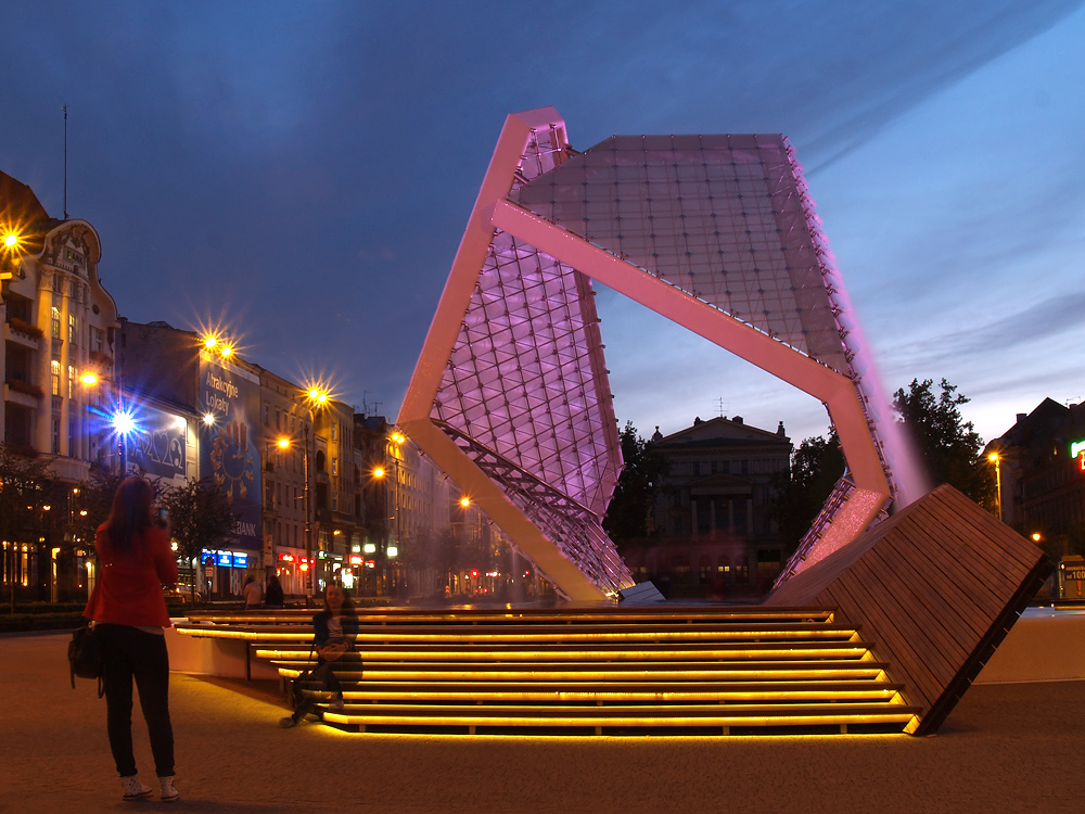 Nr. 980. Plac w centrum Poznania wytyczony na początku XIX w. Od niedawna znajduje się tu nowa fontanna..... Autorami fontanny są Rafał Nowak i Agnieszka Sochaj. Intencją ich projektu było stworzenie miejsca wolnego od zgiełku cywilizacji w centrum miasta poprzez wydzielenie jej za pomocą kaskad wody i światła. Jest to struktura ze szkła giętego mocowana do cięgien rozpostartych na konstrukcji ze stali nierdzewnej. Całość stoi w zbiorniku wodnym nad którym wisi drewniana kładka.... Konstrukcja metalowo-szklanych 9-metrowych żagli po których spływa woda umożliwia ochłodę wewnątrz fontanny, gdy stoi się na kładce.......