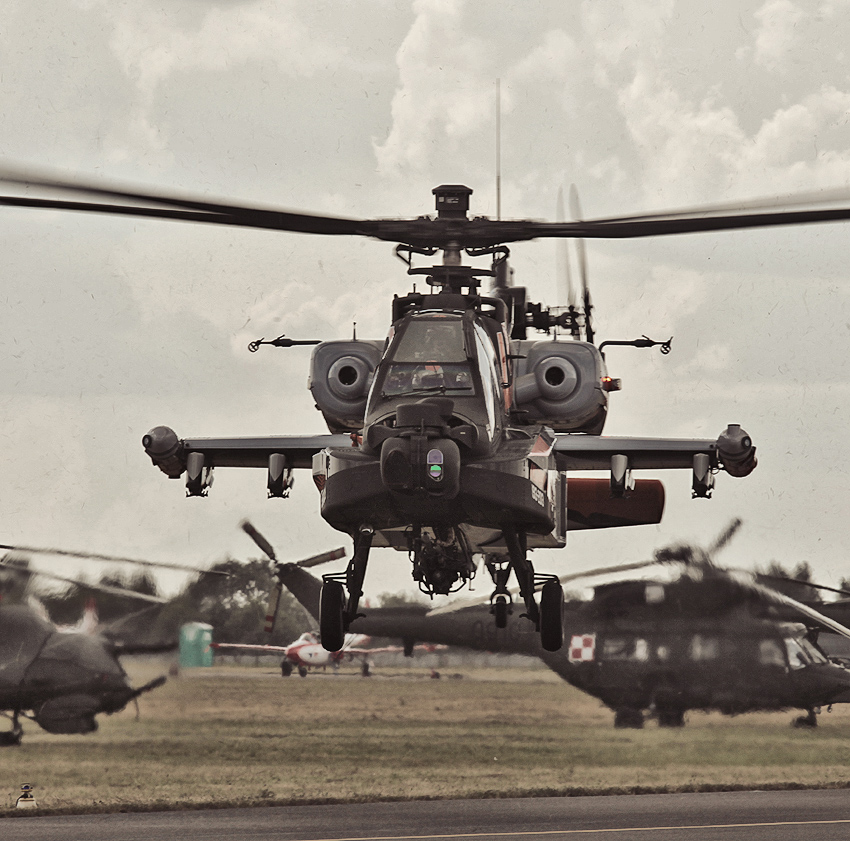 Airshow Radom 2013.Holenderski Apache startuje do pokazu.W tle maszyny należące do Lotnictwa Wojsk Lądowych i Sił Powietrznych - śmigłowce Mi-24 i Sokół oraz samolot TS-11.Paprochy na zdjęciu to trawa z lotniska a nie zasyfiona matryca :).