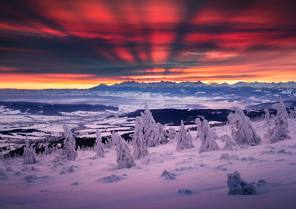 06.01.2019 Niecodzienny wschód słońca na Pilsku w poniedziałek. Strasznie nie chciało mi się wstawać o godz. 0.30 aby wejść na Pilsko na wschód, ale absolutnie było warto, żeby odebrać nagrodę za wysiłek już na górze! Byłem świadkiem dość niecodziennego zjawiska, kiedy tuż przed wschodem na niebie pojawiły się cienie szczytów tatrzańskich podświetlonych słońcem od dołu. Efekt był o tyle niesamowity, że było go widać tylko od strony Beskidu Żywieckiego i Śląskiego. Widziałem już kiedyś podobny motyw ale z takim rozmachem i w takich kolorach jak dziś na pewno po raz pierwszy. To było moje trzecie podejście do Pilska w ciągu ostatnich 11 lat i wreszcie udało się coś zobaczyć ze szczytu :) Mocne wejście w 2020 r.!