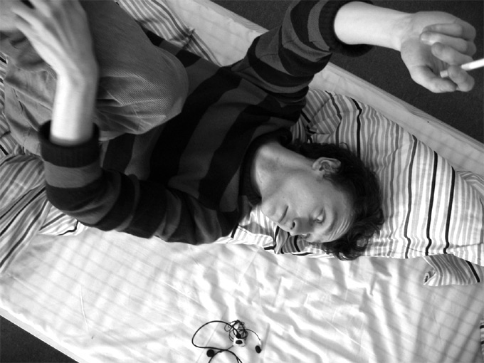 jak dla mnie coś w tym jest. szkoda tylko uciętego fajka i fragmentu łokcia. kadrowałabym bez dołu - słuchawki trochę rozpraszają, a fałdki i bez nich się ostaną. ładne fakturie na prześcieradle i nice światło...no i model niczego sobie...