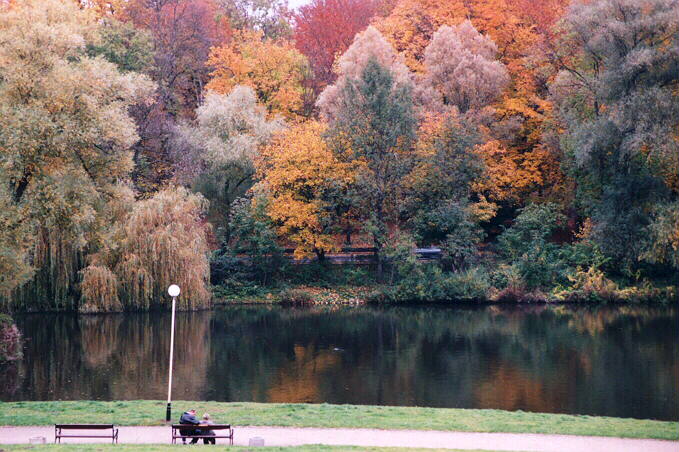 Z nieciekawym niebem u góry byłoby źle. Przyciąłbym jeszcze reszte nieba z góry, lub - jesli akceptujes, a robi tak wielu autorów - uzupełniłbym w PS zieleń w miejscu nieba. Dołu jest akurat, zeby osadzić widoczną lampę. Zgadzam się, że zbyt dużo elementów na focie. Ławka z ludźmi jest OK. Lampę, zwłaszcza że była pochylona można by usunąć (cała fota trzyma pion, co widać po odbiciach w wodzie, a lampa robi wrażenie przechyłu kadru). Kolory MZ właściwie wysycone - takie są w bezsłoneczna pogodę i robią nastrój. Pozdrowienia.