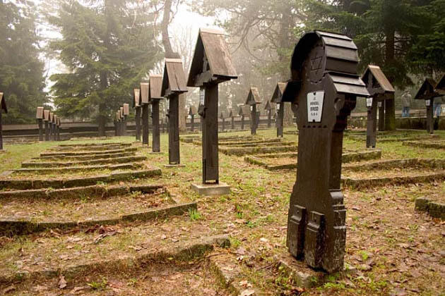 ۞ Cmentarz na przeł Małastowskiej wg projektu Dusana Jurkovica. Zostało na nim pochowanych 174 żołnierzy armii austrowegierskiej.