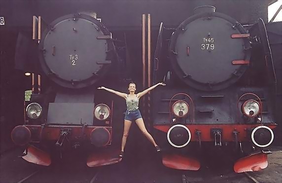 Dwa towarowe parowozy, pomiędzy nimi Kasieńka na ich skrajnych stopniach... To taki żart na koniec roku, tak bawiliśmy się po paradzie kopciuchów w maju 2002 roku... Było w dechę!