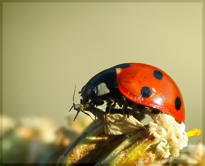 tu biedronka wyszla na morderce przylapanym na goracym uczynku.. ale jakby zlagodzic to zaspiewam.. biedroneczki sa w kropeczki..;)..pozdr... fajne foto...
