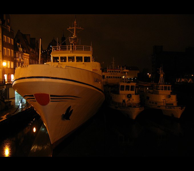 Witaj, namierzałem się, żeby zrobić identyczne zdjęcie białej floty w nocy :-))) ale jak za plecami zaczęło mi chodzić dziwne towarzystwo, to zwinąłem sprzęt i czym prędzej zniknąłem stamtąd. Fajny widok, dobrze oddany nastrój nocnej ciszy na Motławie...