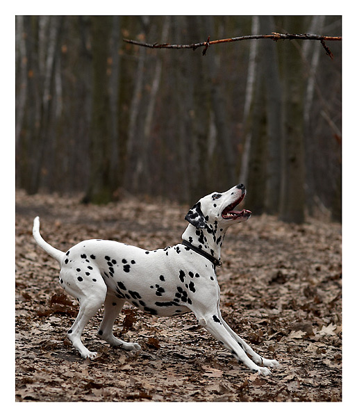 Bardzo ładnie komponujący się pies z liściami na ziemi, kij w górze - idealnie wykadrowane jak dla mnie. brawo!